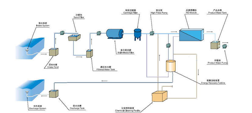 海水淡化設備工藝給水預處理是保證反滲透系統(tǒng)能夠長期穩(wěn)定運行的關鍵,在制定海水預處理方案時應充分考慮到海水中存在大量微生物、細菌和藻類等雜質。微生物的生長不僅會給取水設施帶來許多麻煩,而且會直接影響海水淡化設備及海水淡化工程的正常運轉。周期性漲潮、退潮,海水中夾帶大量泥沙,濁度變化較大,易造成海水預處理系統(tǒng)運轉不穩(wěn)定。海水具有較大腐蝕性,對系統(tǒng)中所采用的設備、閥門、管道件的材質要作一定篩選,耐腐性能要好。