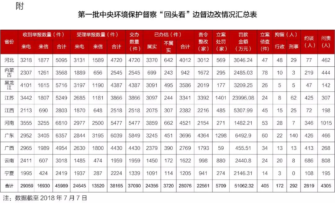 經(jīng)黨中央、國務(wù)院批準(zhǔn),第一批中央環(huán)境保護(hù)督察“回頭看”6個督察組于2018年5月30日至6月7日陸續(xù)對河北、內(nèi)蒙古、黑龍江、江蘇、江西、河南、廣東、廣西、云南、寧夏等10?。▍^(qū))實施督察進(jìn)駐。截至7月7日,全部完成督察進(jìn)駐工作。